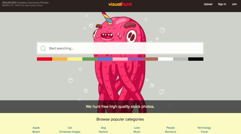 Visual Hunt is an aggregator that sources images from the best free photo websites and puts them all together in one spot. Most of the photographs on the platform are Creative Commons licensed and many other Public Domain pictures pulled from websites like Flickr are also available here. The site lets you pick the best content by offering filters for license, category, and a color palette.
