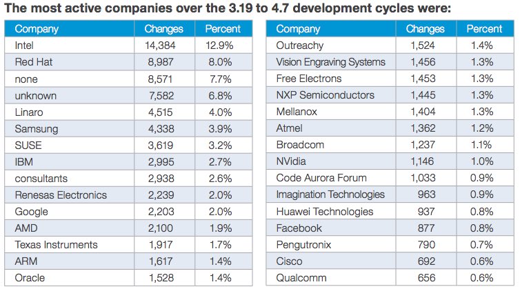 The most active companies over the 3.19 to 4.7 development cycles were Intel, Red Hat, Linaro, Samsung, SUSE, and IBM.