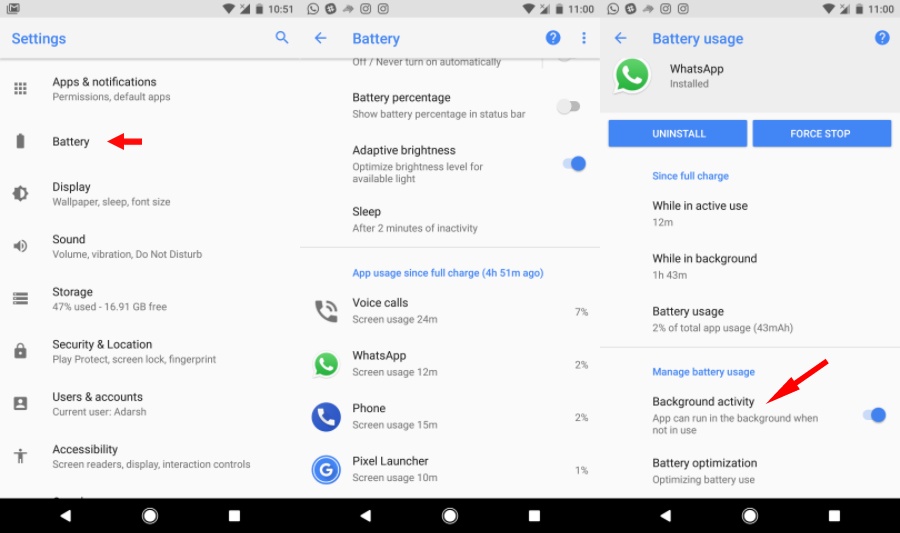 You can force these apps to stop running in the background if you’re not able to get even a day out of your battery. Go to Settings > Battery. Under “App usage since full charge,” look for the apps consuming more battery. Tap them and see if the “While in background” time for such apps is large. Turn off Background Activity for the app. This hidden Oreo feature would allow Android to control the background processes.