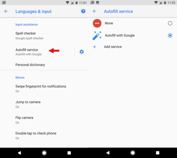 The new Autofill framework allows the Android system to save and suggest autofill data after analyzing the content on your screen. You configure Autofill by visiting Settings > System > Languages & input > Advanced > Autofill service.