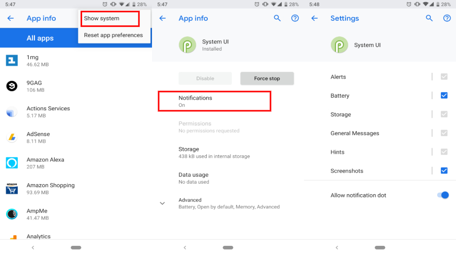 From now on, you can change System UI notifications. To do the same just go Android settings – Apps and notifications – See all apps – Choose show system from the top right menu button – Scroll over to System UI – Tap on Notifications – Tick whichever notification you don’t like (Huff!)