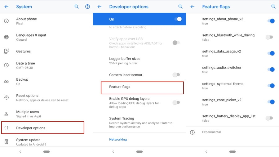 Now go to Developer options under System → Scroll down to Debugging options → Tap on Feature flags
