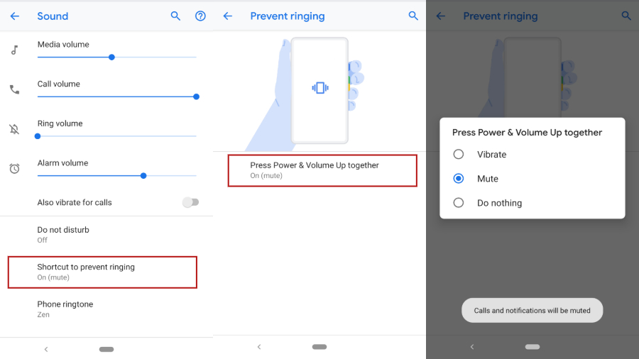 Just go over to Android Settings → Sound settings → Shortcut To Prevent Ringing → Press Power & Volume Up together → Choose Mute or Vibrate or Do nothing.