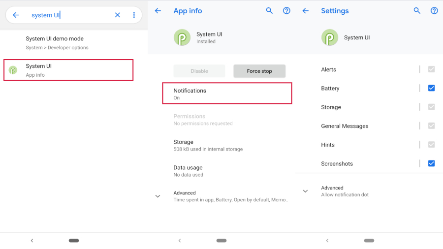 If you no longer feel the need for battery notifications, screenshot notifications, etc. Then head over to System UI app settings and toggle off few systems alerts.