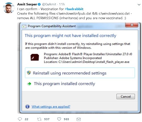 Security researcher Amit Serper tweeted a precautionary measure for Bad Rabbit which you can try out to ensure that you do not get affected.