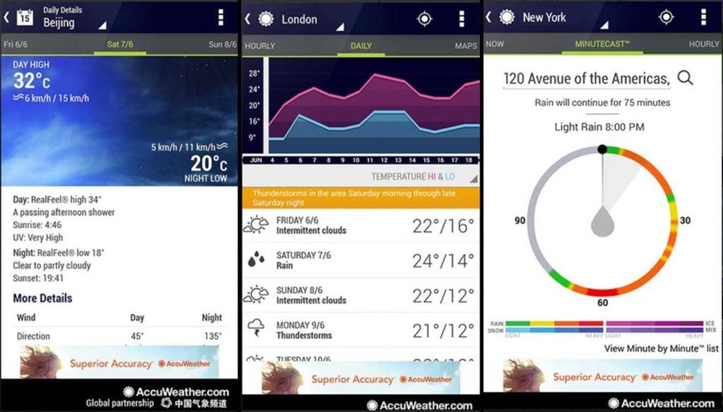 AccuWeather is an excellent weather app for Android that shows high-level accuracy with its weather prediction. It allows you to personalize the weather of your location in many ways and is also available in 33 different languages. The app can show you the temperature in Fahrenheit or Celsius, humidity, wind, and also the hour of sunrise and sunset.