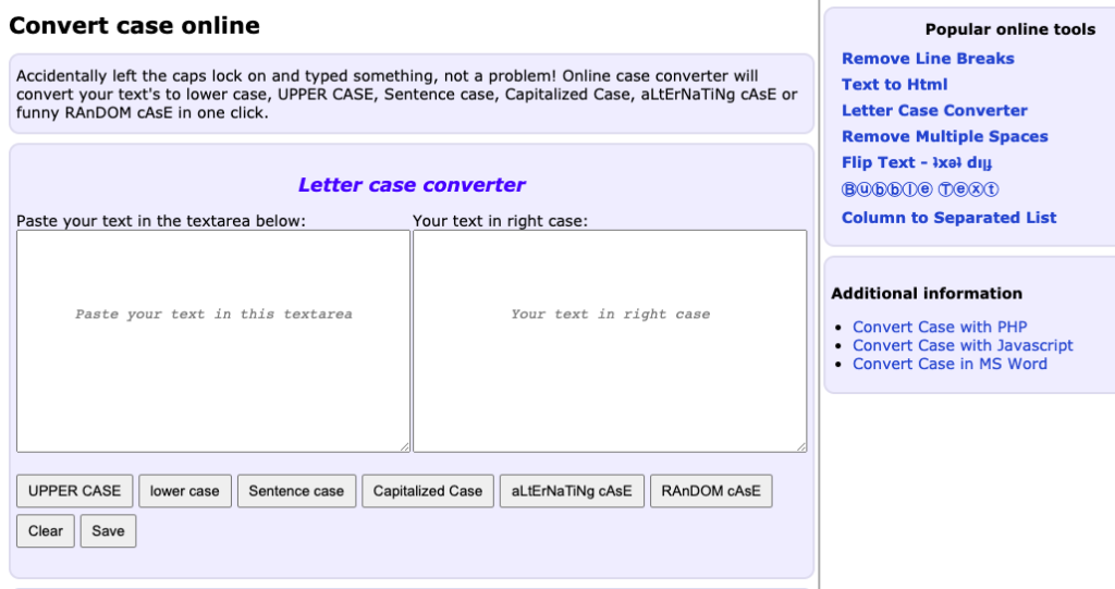 Convertercase is the best free case converter tool on this list because because it offers something beyond the standard title capitalization upper/lowercase. It gives you a bunch of unique case options like Wide case (adds extra space between letters) and Background case (reverse the sentence and its letters).