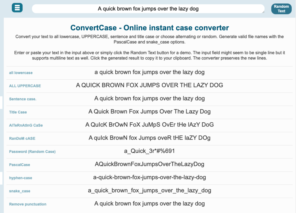 The last text converter we have here is Textfancy. As you can see in the image, it has all different types of case converters that you might need. What’s unique in its offerings is the Password case generator which can take any string and convert it into gibberish letters that can form strong passwords.