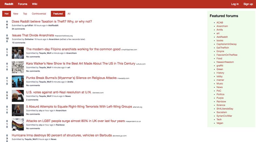 The homepage of Raddit, whose VPS is based in Amsterdam, is clean and ad-free; the posts are categorized under tabs Hot, New, Top, Controversial, Featured, and All. At the right side, the featured forums are listed where the most popular forums (just like subreddits) are listed.
