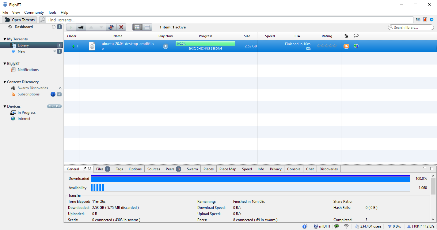Other features of BiglyBT includes Android remote control, various download limit filters, WebTorrent support, I2P support, tags, metasearch, and built-in torrent discovery tools.