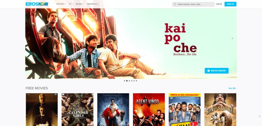 Its catalog provides free access to tons of songs, music videos, and Eros Now original shows. The movie section offers many free movies but viewing them requires a user account which comes at no cost but many features and content is behind a paywall as well.