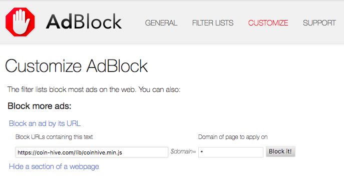 Ad blocking extensions like AdBlock can help you block cryptocurrency mining. Depending on your web browser, you can find relevant settings to block particular domains. For example, in Chrome, for AdBlock, navigate to the list of extension and find AdBlock. There, look for Customize > Block an ad by its URL . Then, add the following text in the text box: