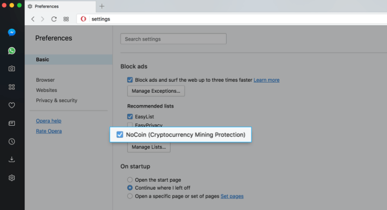 With release of Opera 50 web browser, the company brought in-built functionality to block CoinHive scripts and cryptocurrency mining techniques. This will allow the users to make sure that their computers don’t go crazy whenever any website using the digital coin mining technique is encountered. The users can find this option in Settings (Preferences on macOS) > Basic > Block ads and under the Recommended lists of ad filters.