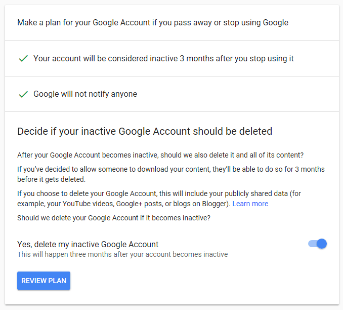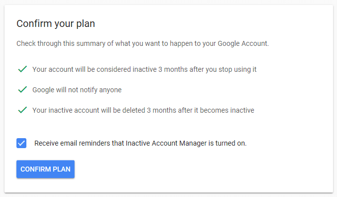 After this, take a look at your inactive account settings and click on Confirm Plan to make it permanent. Google will contact you a month before your account is about to become inactive. And your Google account will be automatically deleted after three months from the day it’s marked as inactive.