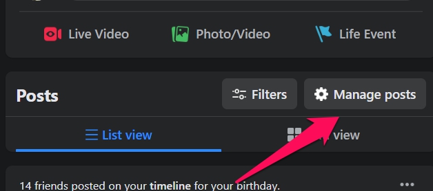 Click on the three-dot button on the right side of the screen. Then click on the Manage posts button next to the Filters button.