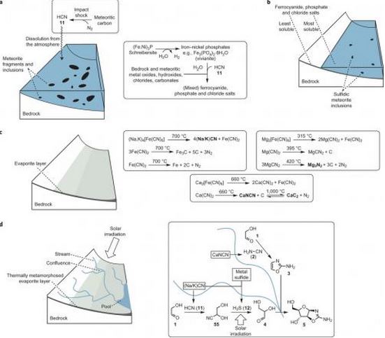 Early meteorites carried with them ingredients that could react with nitrogen in the atmosphere to produce a lot of nitrogen. By dissolving in water, it could have very easily come into contact with hydrogen sulfide, while being exposed to ultraviolet light from the sun. And that, they claim, would have been all that was needed to get things going.