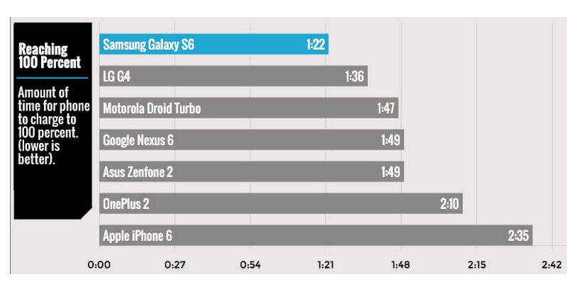 Tomsguide performed the fastest charging phone analysis on the latest flavors of the smartphones that included Samsung Galaxy S6, Apple iPhone 6 and One Plus 2 along with few more.