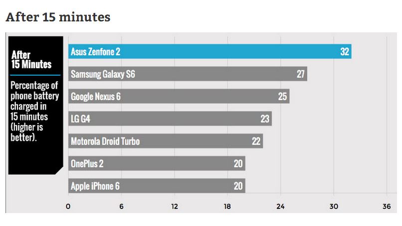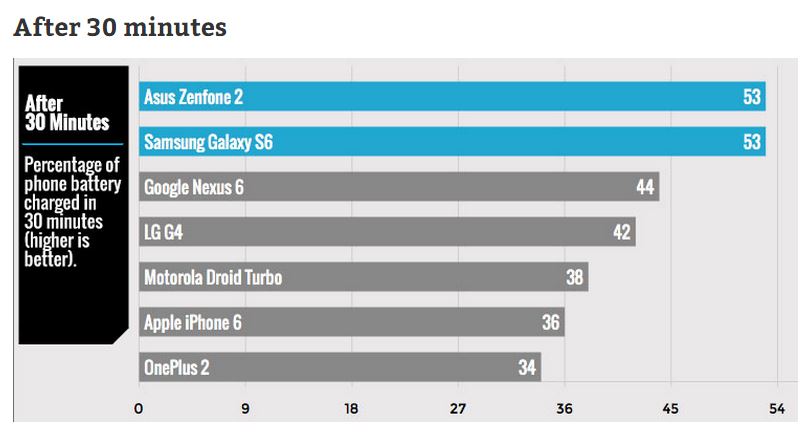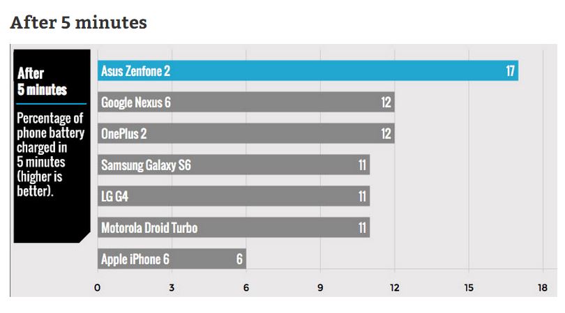 Tomsguide tested all the phones on various levels. They initially juiced out all the phones and then charged them for 5 minutes and checked the percentage of battery charged. So, here come’s the winner in the first heat.Then they charged the phones for 15 minutes and then 30 minutes to get more results. You can see Asus Zenfone 2 still beats its competitors by the clock. And after charging for 30 minutes, the spot is tied between Asus Zenfone 2 and Samsung Galaxy S6.