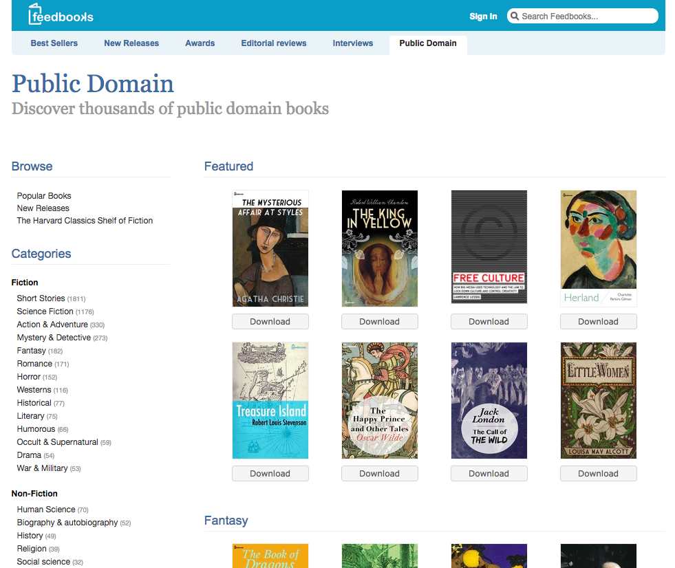 Feedbooks offers an immense collection of original as well as public domain books for free. The website has a neat interface with well-cataloged sections of books ranging from Short Stories, Mystery Novels, Action, Fantasy, History to even Academic Books and much more.