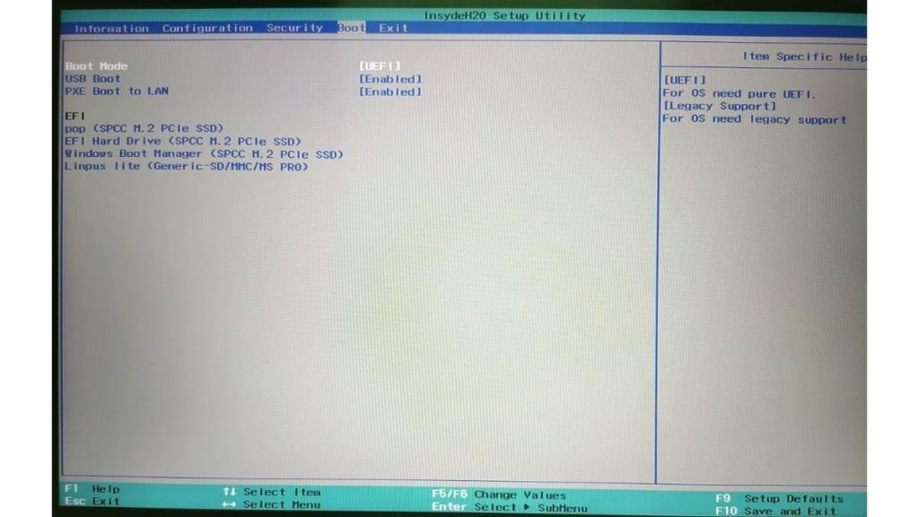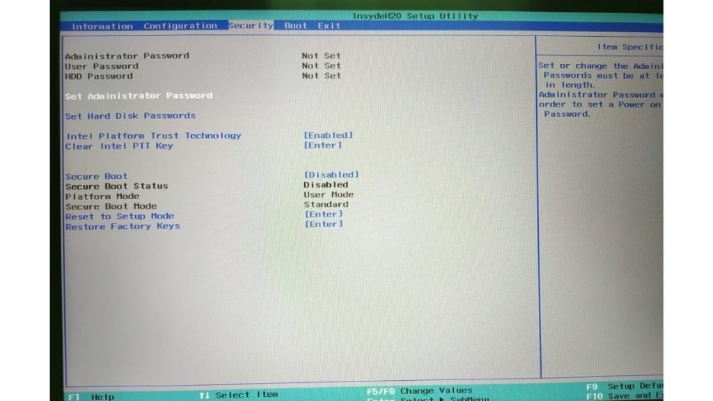 5. Under security , make sure secure boot is disabled. Under boot options , make sure it’s set to UEFI . Now, not every interface looks like this, but the terms will probably be the same. Save your settings and exit BIOS (Usually, every button’s functions will be visible under the options in the BIOS, as you can see in both the pictures).