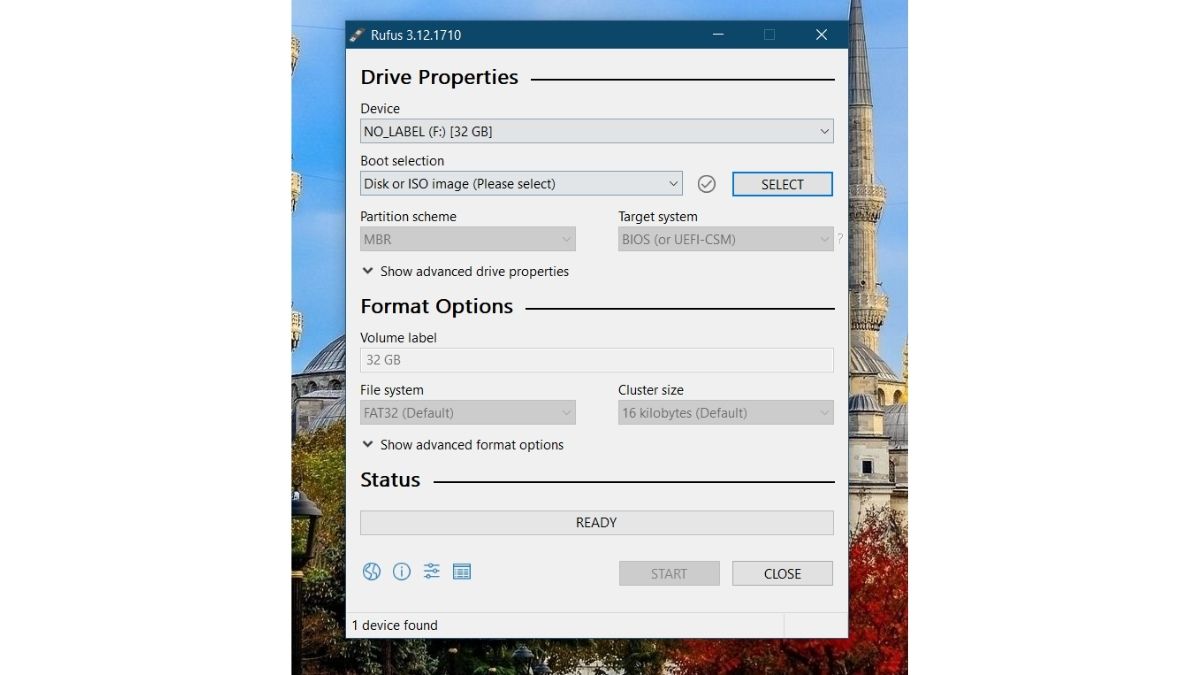 3. Your flash drive will be automatically detected by Rufus. Click on the Select button
