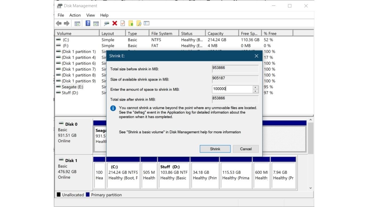 3. Right-click on your drive and click on “ Shrink Volume .” Enter the amount of space to be shrunk (in my case, 100GB) and Click on “ Shrink .” This will create an empty partition on the Drive. You will now see an “ Unallocated ” partition.