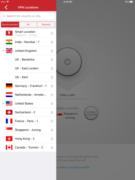 The ExpressVPN iOS app , when used on the iPad, looks like a blown-up version of its iPhone and Android siblings. You can see the same Connect button, smart location suggestion, and the option to choose location manually.