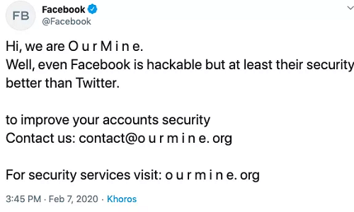 The group posted a tweet from the official Facebook and Messenger Twitter accounts, reading: “Hi, we are OurMine. Well, even Facebook is hackable, but at least their security better than Twitter.”