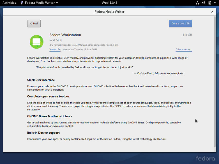 Fedora Media Writer – earlier LiveUSB creator – is a utility to create bootable installation media and LiveUSB of various Fedora editions, Spins, and Labs. It offers a clean user interface to the users and helps them find and download the latest Fedora release.