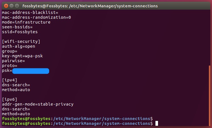 4. Now with the help of cat command followed by the network name, you can see the saved details. Under the section, WiFi-Security, you can find the password which will be prefixed by “psk=”. Also, don’t forget to replace Fossbytes by your own network name: