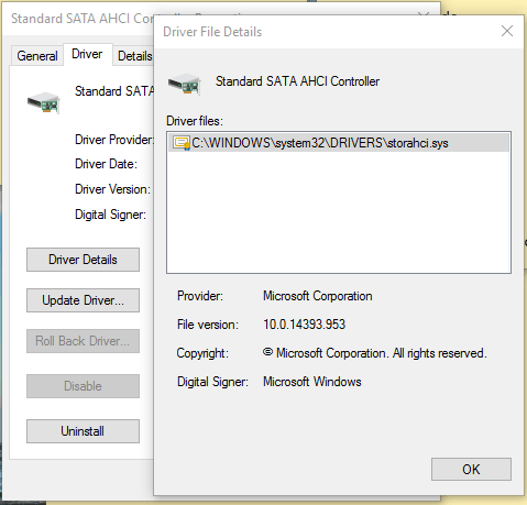 Under Driver tab, click Driver Details. If it shows C:\Windows\system32\DRIVERS\storahci.sys in the Drivers files field, then your system might be affected due to the bug.