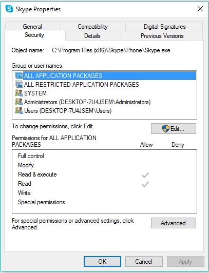 For Skype, the high disk usage goes down when write permission is granted for ALL APPLICATION PACKAGE group. Follow these steps to fix 100% disk usage issue if it’s because of Skype. This method is for the desktop version of Skype, not for the Windows Store version.