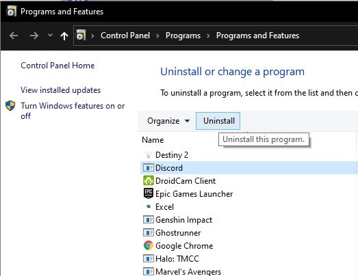 1. Search Discord in the search menu and select Uninstall in the side menu.