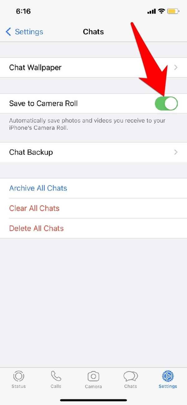 3. Once in the Chats menu, toggle the “Save to camera roll” button on.