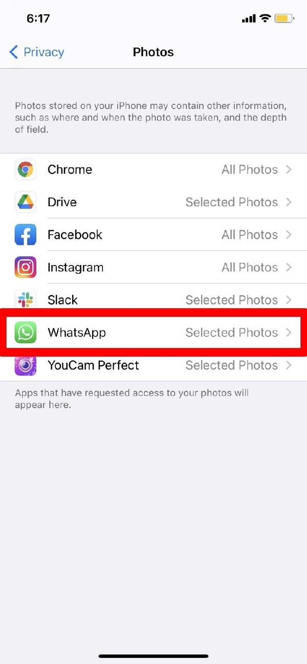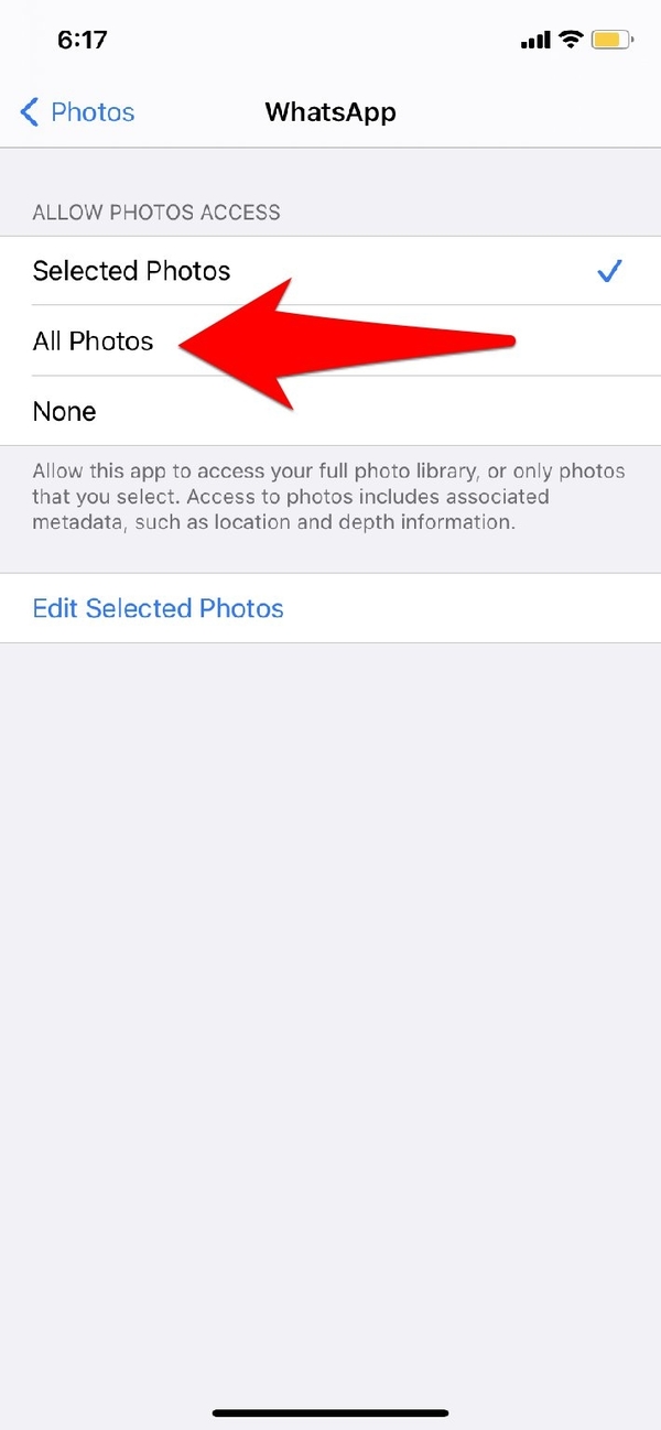4. In the WhatsApp menu of privacy settings, change the allow photos access to “All Photos.”