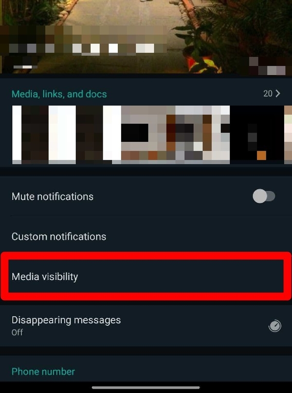 2. Open the chat settings by tapping on the contact’s name and click on “Media Visibility.”