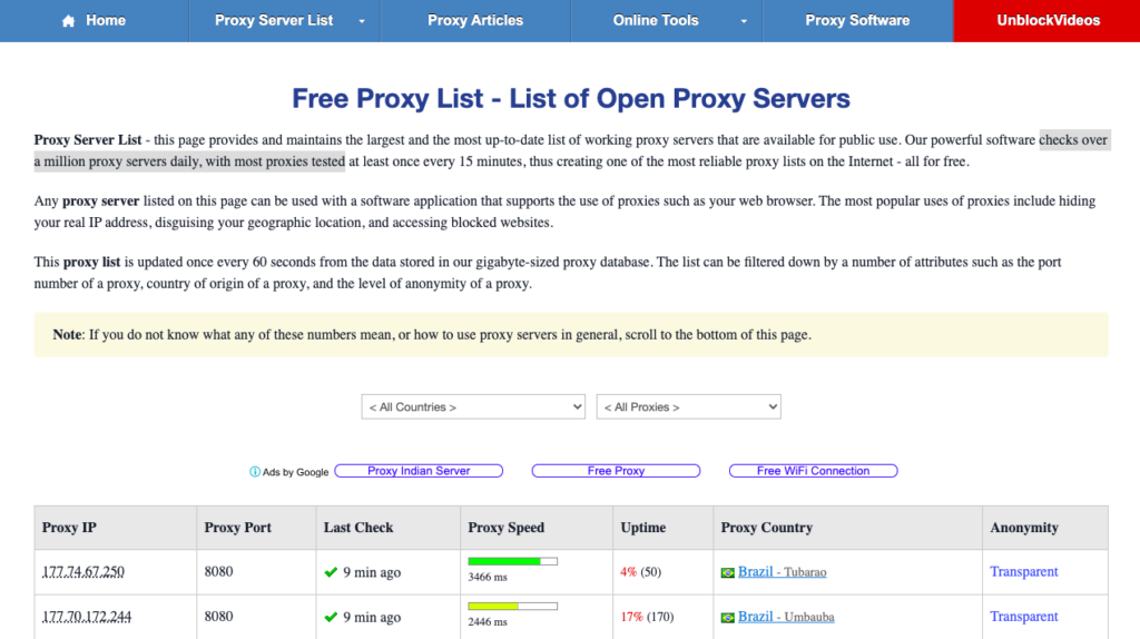 ProxyNova is another website to get a list of highly functional free proxies. The website checks over a million proxy servers daily, with most proxies, tested every 15 minutes, and the proxy list is updated once every 60 seconds.