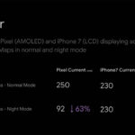 In a number of slides on power consumption, Google showcased how a Pixel’s (2016 model) normal high brightness mode affects the battery, in comparison to the device during “Dark Mode”.