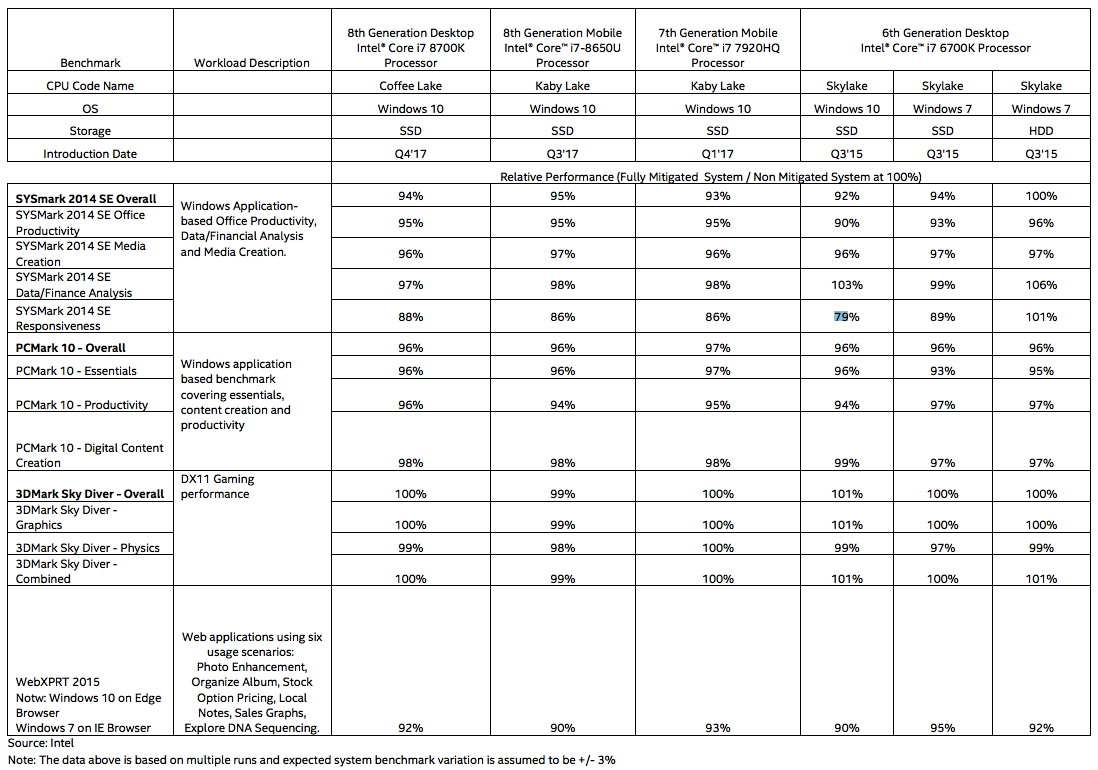 8th gen CPUs (Coffee Lake, Kaby Lake) with SSDs will feel a smaller impact. As per SYSmark benchmark, the overall performance impact will be 6-4% for Office Productivity, Data/Financial Analysis, and Media Creation. The same numbers are reflected by PCMark and 3DMark benchmark.