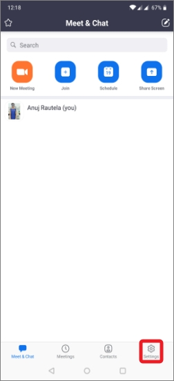 Open the Zoom app on your smartphone and look for the ‘Settings’ option in the bottom right corner. Click on it.