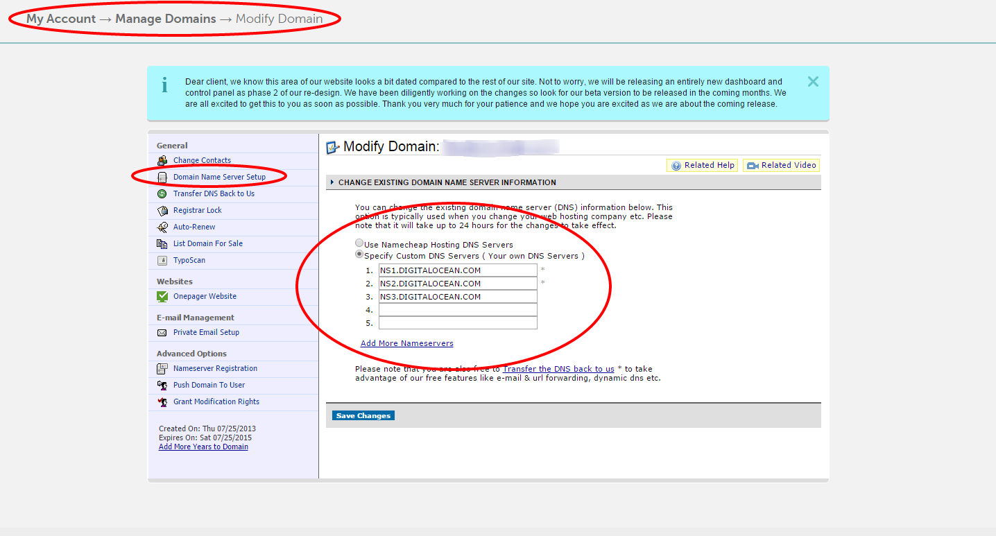 Modify your DNS settings at Digital Ocean