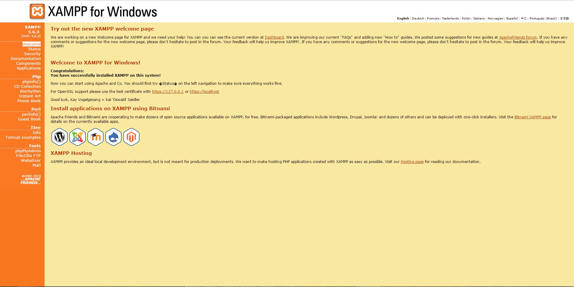- Open https://localhost in your browser. You will see a splash page of XAMPP, select your language and it will open XAMPP web admin panel.