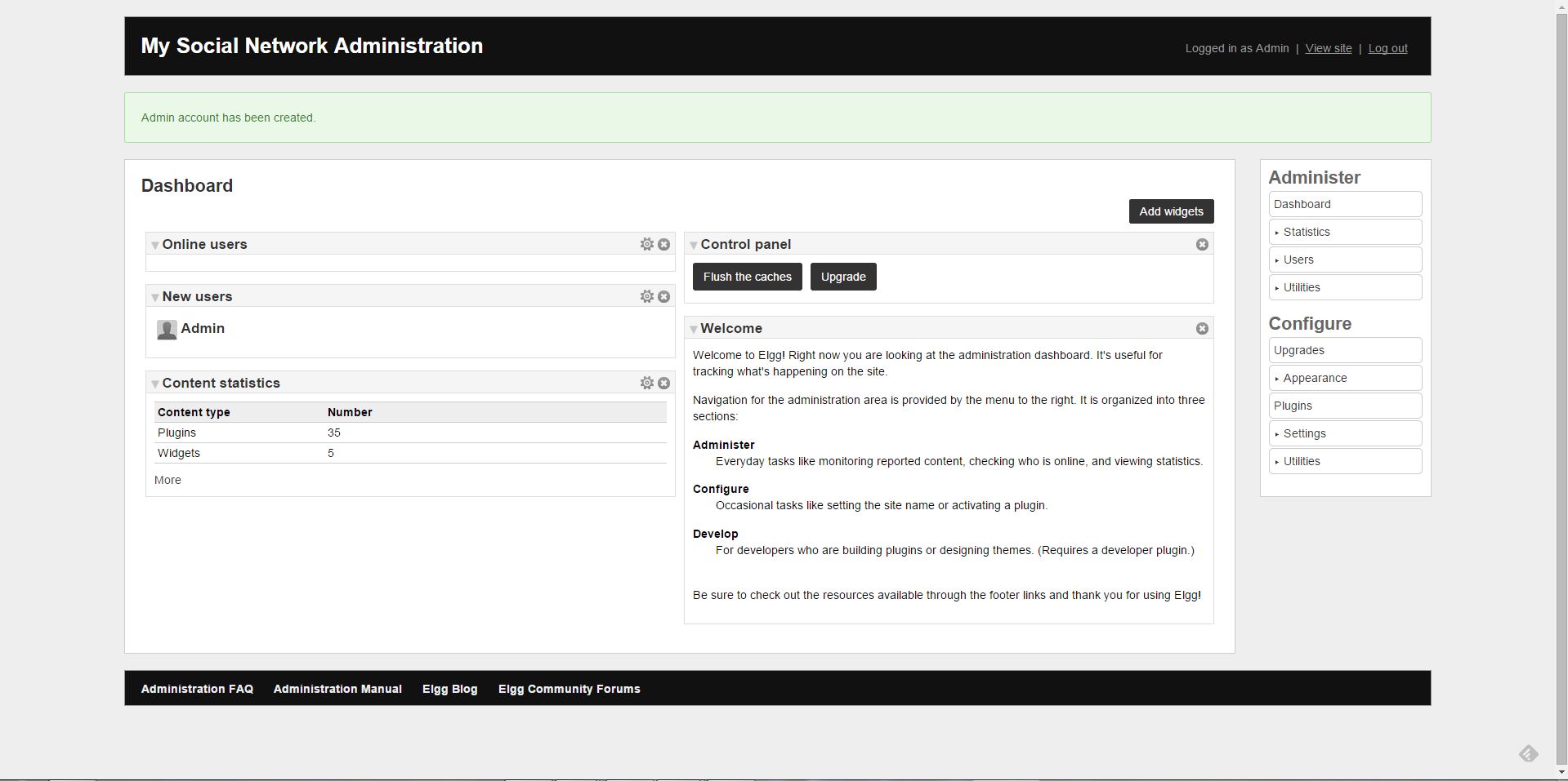 You have your own social network website up and running. Now you can use the administration panel to make this site as you want. You can change the look and feel, functionality, add plugins for more features and much more. Admin panel can be accessed at https://localhost/mysocialnetwork/admin with the credentials you have created while installing Elgg.