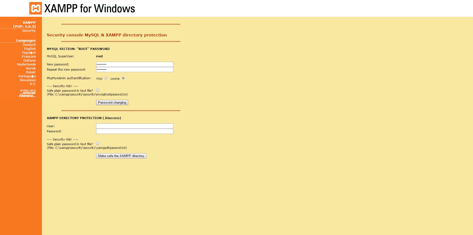 Let’s secure MySQL by clicking on the link https://localhost/security/xamppsecurity.php and setting up the password for MySQL root user –
