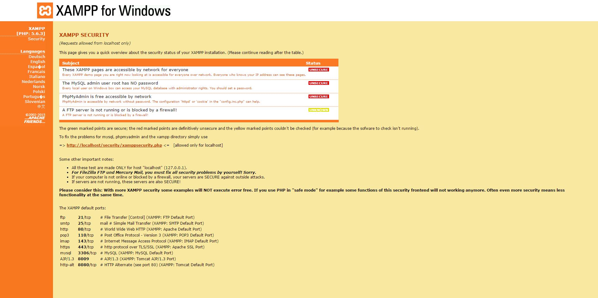 There is one important thing we should never forget to do is to check the security settings. Click on the security link on the left sidebar of the admin panel. You will see that MySQL has root user but no password and hence showing insecure –