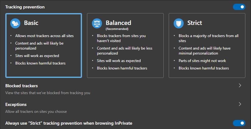 3. If you still can’t access a site, turn the tracking prevention to Basic or add the website to Exceptions.