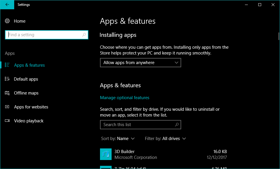 On the Apps & Features screen, click on “