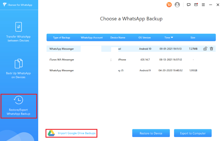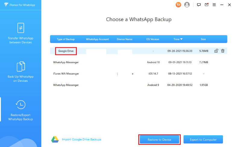 Transferring WhatsApp backup from Google Drive to iPhone is one thing, but iTransor for WhatsApp can do a lot more. Instead of getting yourself locked into iCloud or Google Drive backups, you can backup your chats to your PC or Mac instead.