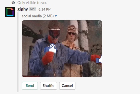 - Select any Slack conversation and enter “/giphy” followed by any keyword, for instance, “/giphy social media” (without parentheses). Next, hit Enter or click on the send button. (Don’t worry it won’t send anything yet but only show you a preview)
