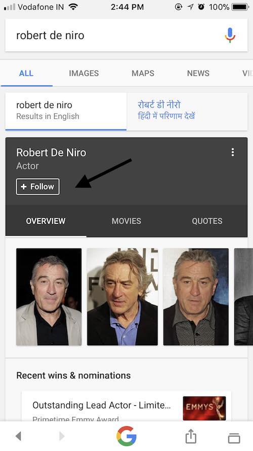 To use Google Feed, you need to have Google App installed on your Android and iOS devices; make sure that the app is up-to-date. To add a new topic, you have to first search it in the app. For example, on my iOS device, I searched for Robert De Niro in Google app. You can spot the Follow button.